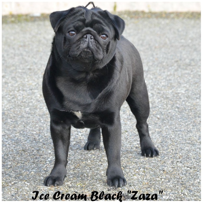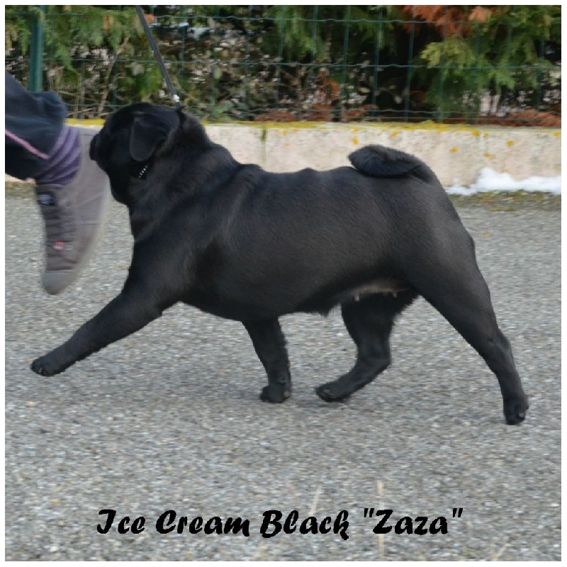 Excellent sujet, proportions, tête, crâne, oreilles, yeux, pigmentation, narines et denture, av. main. Tâche blanche au poitrail. Exc. poitrine et ligne de dos, postérieurs, queue bouclée et plaquée. Exc. démarche